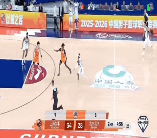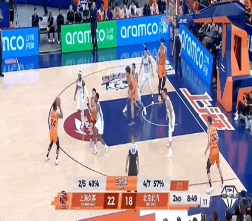 杰曼面对刘礼嘉,从左路突进,将球塞给塔瑞克,后者跃起擦板得分。古德温带球,分刘礼嘉后回传到自己手上,正面拔起三分不进。杰曼拿到篮板,一条龙直冲篮下,拉杆再进!北京队将比分逼近到30-34,上海队叫停比赛。