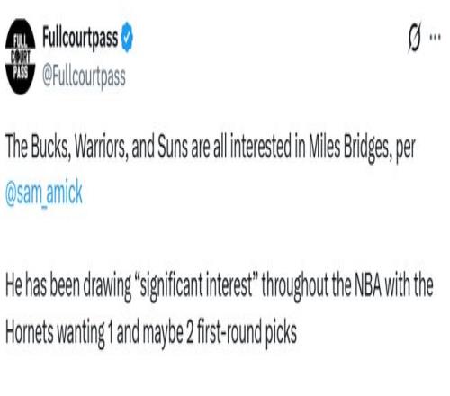 北京时间1月23日,随着交易截止日日益临近,黄蜂队前锋迈尔斯-布里奇斯已引发多支球队的强烈交易兴趣。据名记萨姆-阿米克报道,勇士、雄鹿和太阳均在追逐这位27岁球员的球队之列。