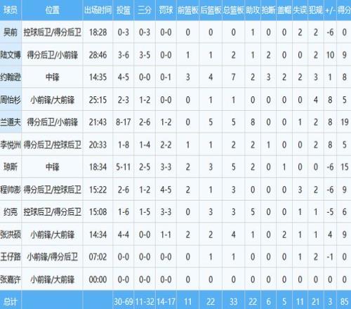 本场比赛,程帅澎时隔一个多月迎来了复出,替补出战约15分钟,投篮6中2,其中三分2中1,罚球5中4贡献9分3板,出现了3次失误,这哥们过去遭遇了右侧臀大肌部分撕裂。