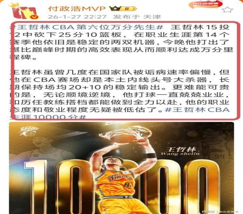 媒体人付政浩发文称: 王哲林15投12中砍下25分10篮板,在职业生涯第14个赛季他依旧是稳定的两双机器,今晚他打出了堪比巅峰时期的高效表现从而顺利达成万分里程碑。王哲林虽曾几度在国家队被诟病速率偏慢,但他在CBA赛场却是本土内线头号大杀器,长期保持场均20+10的稳定输出。更难能可贵的是,无论顺境逆境,他打球一直兢兢业业,和历任教练搭档都能做到全力以赴,他的职业态度和敬业程度无疑被低估了。
