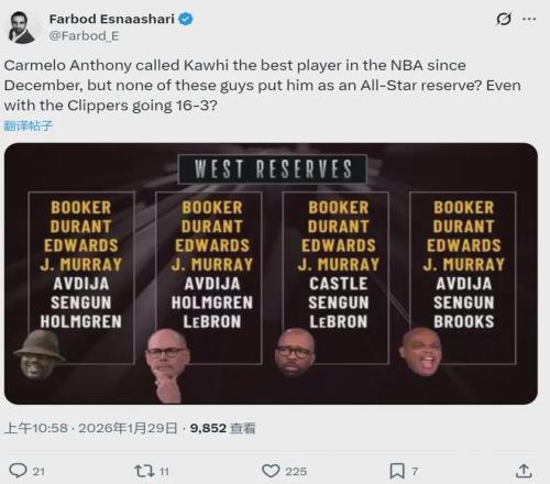 全明星替补阵容是由30支球队主教练投票选出,TNT天团这次投票虽然无法决定伦纳德是否入选全明星,但也间接表明了媒体对各个球员的态度。有四个球员是TNT天团四人共同选择的:布克、杜兰特、爱德华兹和贾马尔-穆雷。