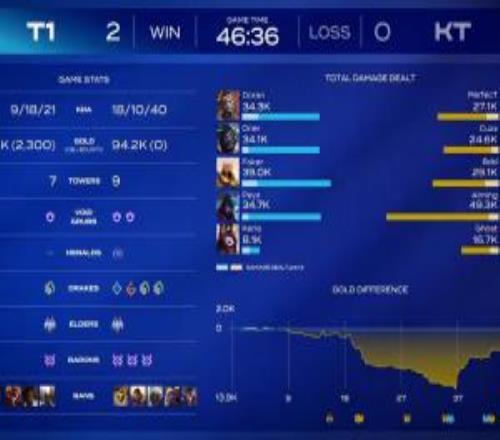 体育资讯01月23日报道宣称 T1 2:0 KT,赛后数据面板显示T1在落后13.9k经济差的情况下最终翻盘比赛。