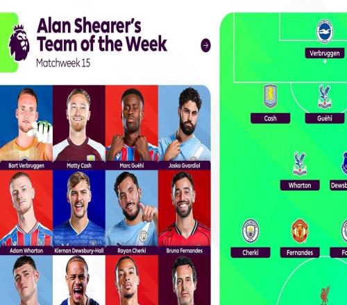 英超官方发布了阿兰-希勒评选的英超第15轮最佳阵容,埃基蒂克、福登、布鲁诺-费尔南德斯、哈维-西蒙斯等人在列。阿兰-希勒评英超第15轮最佳阵容门将:费布鲁亨(布莱顿)后卫:卡什