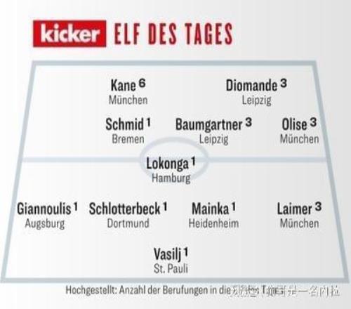 12月8日报道宣称 随着多特蒙德2-0战胜霍芬海姆,德甲第13轮的比赛全部结束,德国著名足球媒体《踢球者》评选了本轮最佳阵容。完成帽子戏法的拜仁慕尼黑前锋凯恩本赛季第6次入选