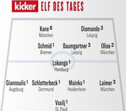 踢球者评德甲本轮最佳阵容:凯恩、奥利塞、莱默尔等人在列