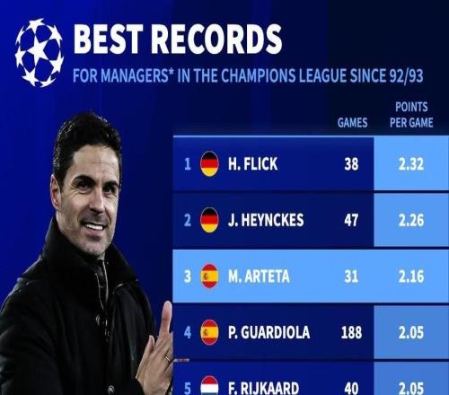欧冠联赛阶段第7轮,阿森纳客场3-1击败国米。据德国转会市场网站统计,在执教欧冠至少25场的主帅中,阿尔特塔场均积分仅次于弗里克和海因克斯。执教欧冠25+场主场场均积分排行1