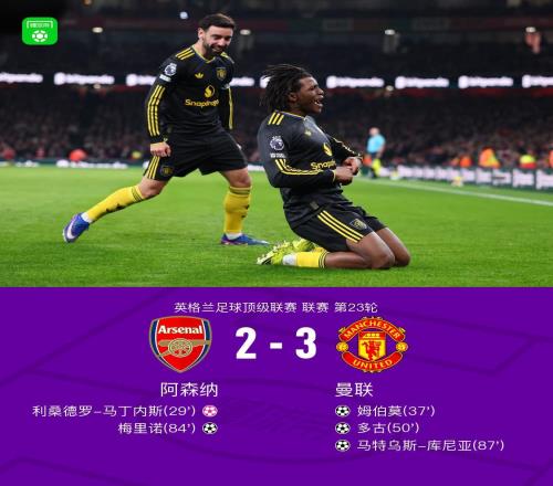 英超第23轮,曼联客场3-2逆转击败领头羊阿森纳,这是曼联自2021年3月以来首次在英超客场击败领头羊。